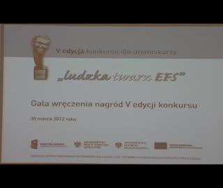 Sekretarz Stanu w Ministerstwie Pracy i Polityki Społecznej Jarosław Duda wręczył nagrody laureatom V edycji konkursu "Ludzka twarz EFS", w którym pierwszą nagrodę otrzymała Monika Cetera za tekst opublikowany w gazecie „Co tydzień” i portalu jaw.pl pt. „Uśmiech Steviego Wondera *”.