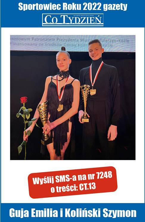 CT.13 Guja Emilia i Koliński Szymon (taniec towarzyski) – Mistrzowie Polski w kombinacji 10 tańców, I V-ce Mistrzowie Polski w tańcach latynoamerykańskich, II V-ce Mistrzowie Polski w tańcach standardowych (Szkoła Tańca Sukces).