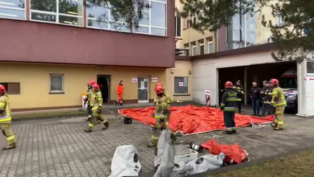 Strażacy budują namioty i stanowiska do odkażania - to przygotowania na wypadek wystąpienia sytuacji kryzysowej. Konstrukcje są stawiane prewencyjnie, w celu ewentualnej selekcji pacjentów, aby oddzielić potencjalnych zarażonych od tych zdrowych.