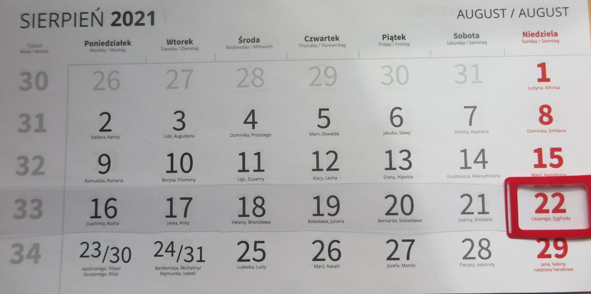 Imieniny obchodzą: Cezary, Maria, Albin, Bernard, Bolesław, Filip, Hipolit, Jan, Joachim, Magdalena, Zygfryd