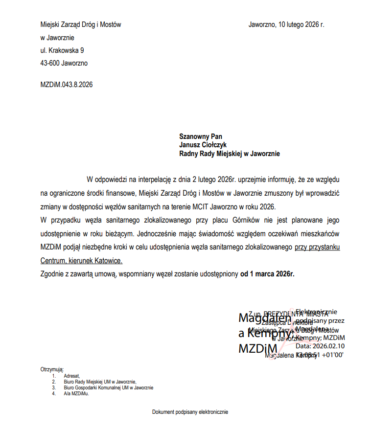 W piśmie (odpowiedź na interpelację z 2 lutego 2026 r.) MZDiM informuje wprost, że z powodu ograniczonych środków finansowych wprowadzono zmiany w dostępności węzłów sanitarnych w 2026 roku.