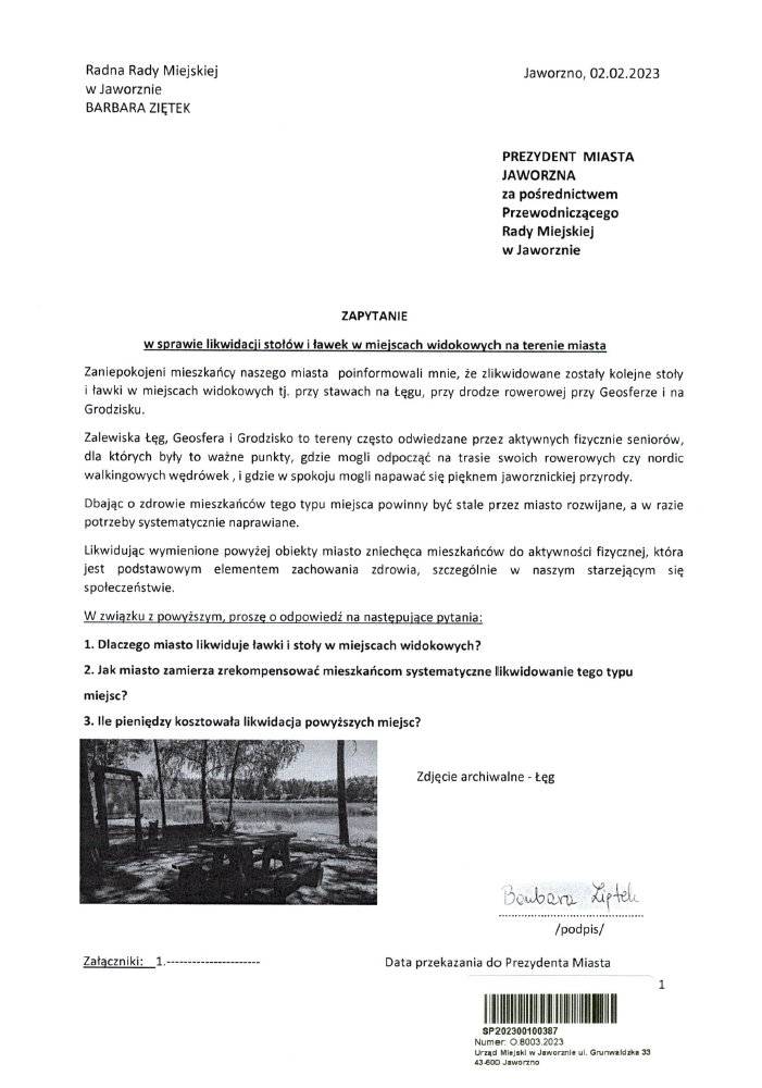 Radna Barbara Ziętek napisała interpelację do Prezydenta Miasta Jaworzna dotyczącą likwidacji ławek i stołów w różnych miejscach widokowych na terenie Jaworzna. Zrobiła to w związku licznymi zapytaniami mieszkańców naszego miasta, którzy zwrócili uwagę, że w miejscach takich jak: Geosfera, Grodzisko czy stawy na Łęgu likwidowane są właśnie stoliki i ławki, z których chętnie korzystali. Radna zwróciła uwagę, że likwidacja takich obiektów architektury małej może zniechęcić jaworznian do aktywności fizycznej.