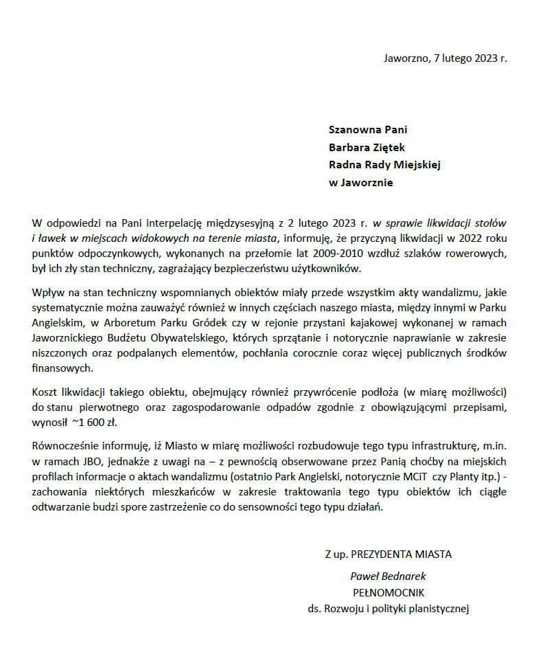 Odpowiedzi udzieli pełnomocnik prezydenta Paweł Bednarek. Z odpowiedzi na interpelację radnej możemy dowiedzieć się, że likwidacja wymienionej wyżej architektury małej była podyktowana jej złym stanem technicznym, który zagrażał bezpieczeństwu użytkowników. Taki stan spowodowany był licznymi i systematycznymi aktami wandalizmu, które zostały odnotowane choćby w Parku Angielskim, w Arboretum Parku Gródek czy w rejonie przystani kajakowej — czytamy w odpowiedzi. Notoryczne naprawianie kosztuje coraz więcej finansowych środków publicznych, dlatego podjęto decyzję o likwidacji — dodaję w odpowiedzi Urzędnik.