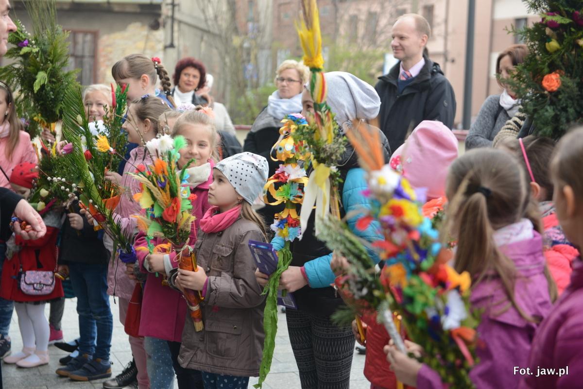 Niedziela Palmowa w kolegiacie, 11 kwietnia 2014[/caption]Dawnym zwyczajem Niedzielę Palmową zwano Kwietną. W XVI wieku pisał z przekąsem Mikołaj Rej pisał: „W Kwietną Niedzielę kto bagniątka (współczesne to bazie – przyp. red.) nie połknął, a dębowego Chrystusa do miasta nie doprowadził, to już dusznego zbawienia nie otrzymał”. „Bagniatka” połykano nie tylko z myślą o zbawieniu duszy, ale również dla ochrony przed wszelkimi chorobami. Na pamiątkę wjazdu Jezusa do Jerozolimy wprowadzano uroczyście do kościołów wózki z drewnianymi figurami Chrystusa siedzącego na osiołku.