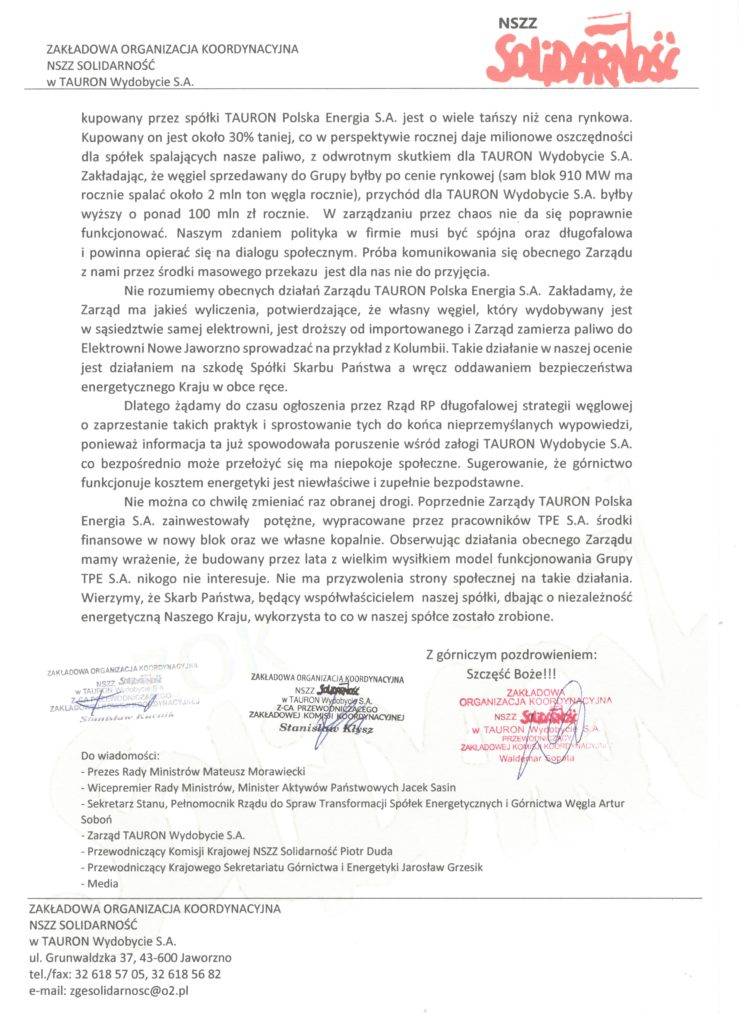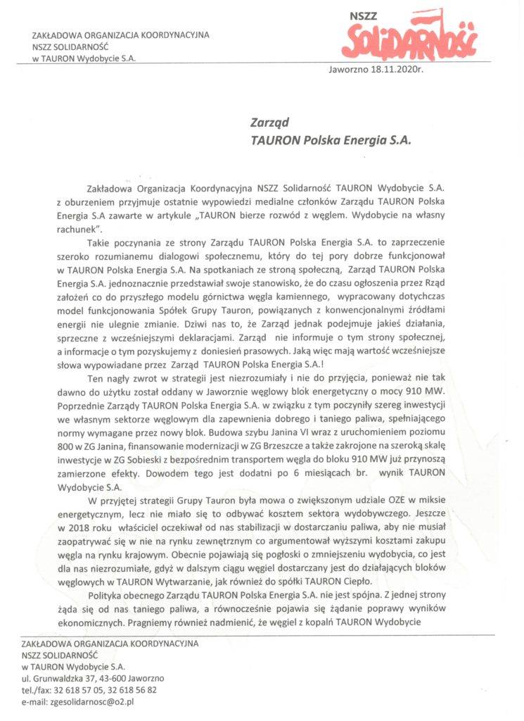 Związkowcy z NSZZ Solidarność w TAURON Wydobycie zwrócili się pismem do zarządu TAURON Polska Energia, w którym wyrażają swoje oburzenie dotyczące zaprzestania finansowania inwestycji w sektorze wydobywczym.