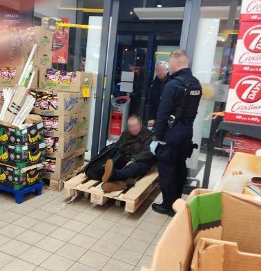 Mężczyzna nie miał zamiaru wychodzić ze sklepu i położył się na palecie.
