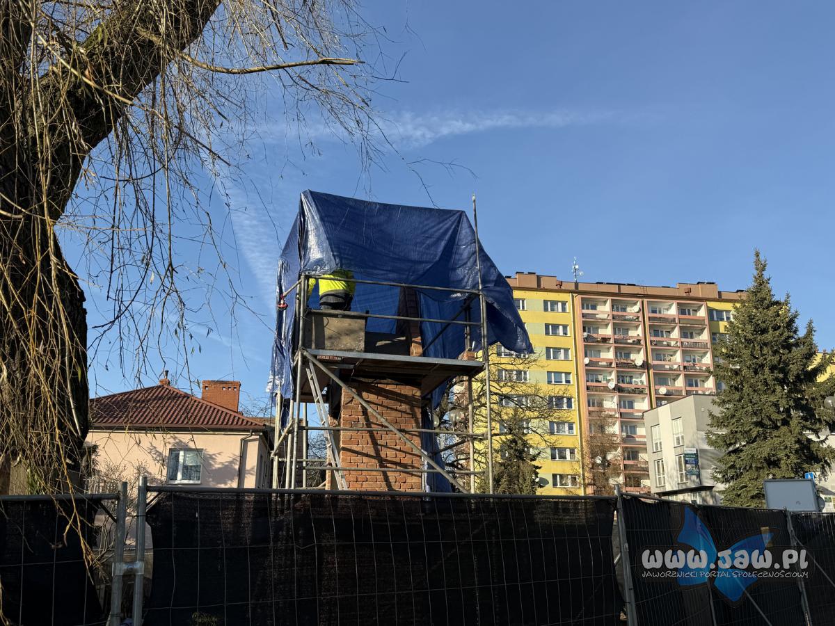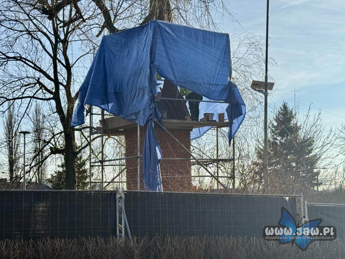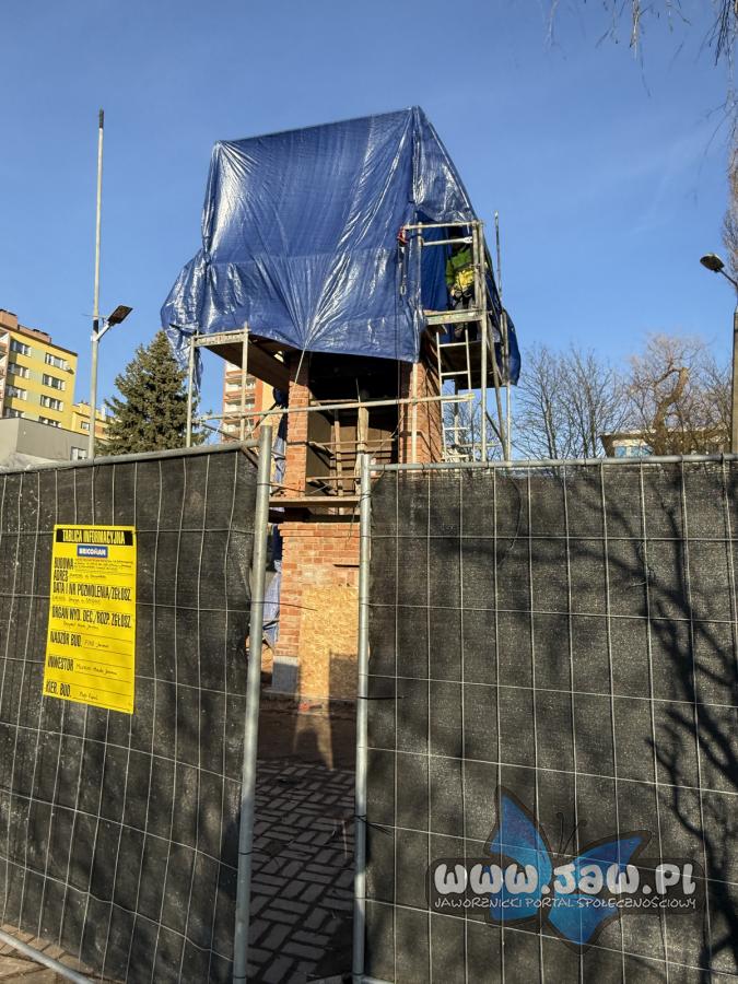Kapliczka gietrzwałdzka w centrum Jaworzna nabrała już wyraźnych kształtów. Po około miesiącu od rozpoczęcia układania kostki, powstała już wysoka na kilka metrów konstrukcja. Widać już kształt obiektu oraz miejsce, gdzie zostanie wstawiona figura.