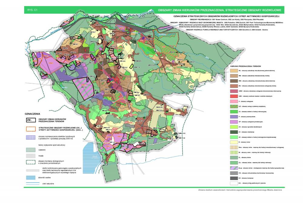 Nowa wersja Studium uwarunkowań i kierunków zagospodarowania przestrzennego Miasta Jaworzna stanowi próbę odpowiedzi na powyższe pytanie. Główny punkt ciężkości w tym strategicznym dokumencie został położony na powiększenie i uspójnienie obszarów, które w przyszłości mają stać się zapleczem terenowym dla nowych przedsięwzięć produkcyjnych i usługowych. Aby móc myśleć o rozwoju nowych gałęzi gospodarki w Jaworznie, Gmina musi dysponować zasobem terenów, na którym będzie to możliwe. Zgodnie z dotychczasowymi procesami urbanistycznymi tereny przemysłowe są wskazywane w zachodniej części miasta. Część północna i wschodnia tradycyjnie ma stanowić "zielone płuca" i obszary rekreacyjne dla mieszkańców.