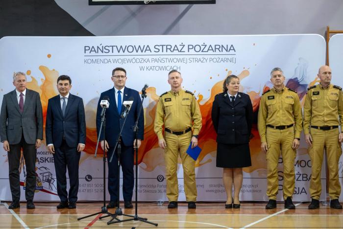 W uroczystym przekazaniu wozów uczestniczyli m.in. wojewoda śląski Marek Wójcik, marszałek województwa śląskiego Wojciech Saługa, prezes WFOŚiGW w Katowicach Mateusz Pindel oraz śląski komendant wojewódzki PSP st. bryg. Damian Legierski.
