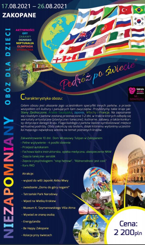 Celem obozu jest ukazanie jego uczestnikom specyfiki innych państw, a przede wszystkim ich kultury i panujących tam zwyczajów. Przybliżymy takie kraje jak: Stany Zjednoczone, Arabia Saudyjska, Japonia, Włochy i Francja. Na zapoznanie się z każdym z państw zostaną przeznaczone 1-2 dni, w trakcie których odbędą się warsztaty artystyczne (plastyczne i taneczne), kulinarne, zabawy, a także konkursy dotyczące danego kraju. Flaga każdego z państw będzie symbolizować miejsce wirtualnej podróży. Obóz zakończy się testem, dzięki któremu wyłonimy uczestnika mającego największą wiedzę na temat poznanych krajów.