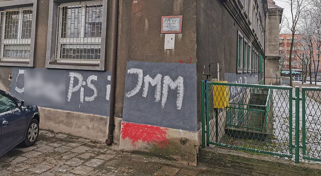 W poniedziałek o tym fakcie informowali nas czytelnicy jaw.pl. Dziś sprawdziliśmy to na miejscu i faktycznie, wulgarne hasła w kierunku ugrupowań politycznych i osób publicznych widnieją na ścianie zwróconej w kierunku placu zabaw.
