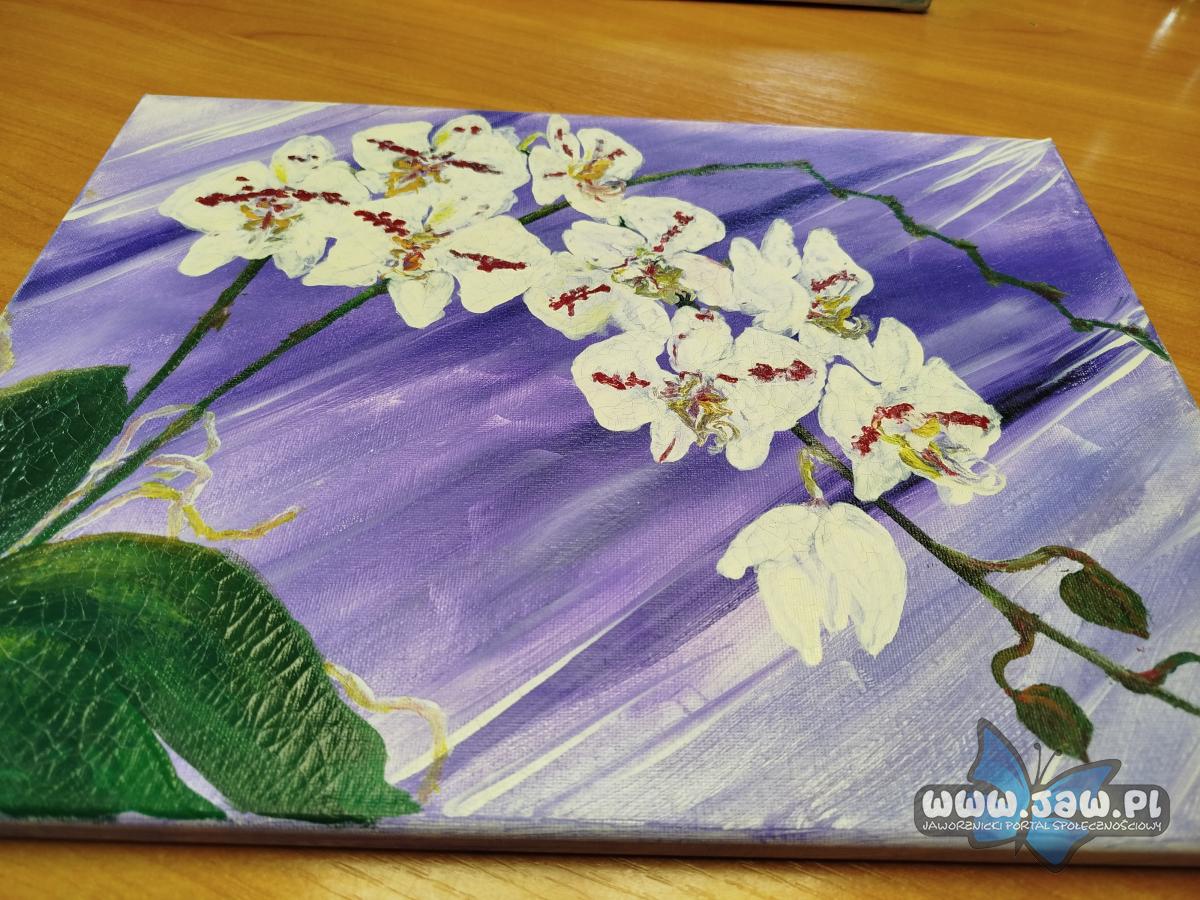 Autorką jest Lidia Miś. Wymiary obrazu to 30x 40 cm. Biały kwiat – storczyk na fioletowym tle, zachwyca swoim pięknem z charakterystycznymi plamkami na śnieżnobiałych płatkach, soczystością zielonych liści, kolorowych pączków budzących się do życia. Obraz namalowany w 2022 roku akrylem werniksowanym.