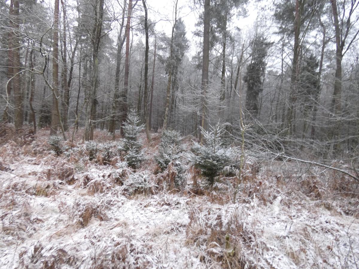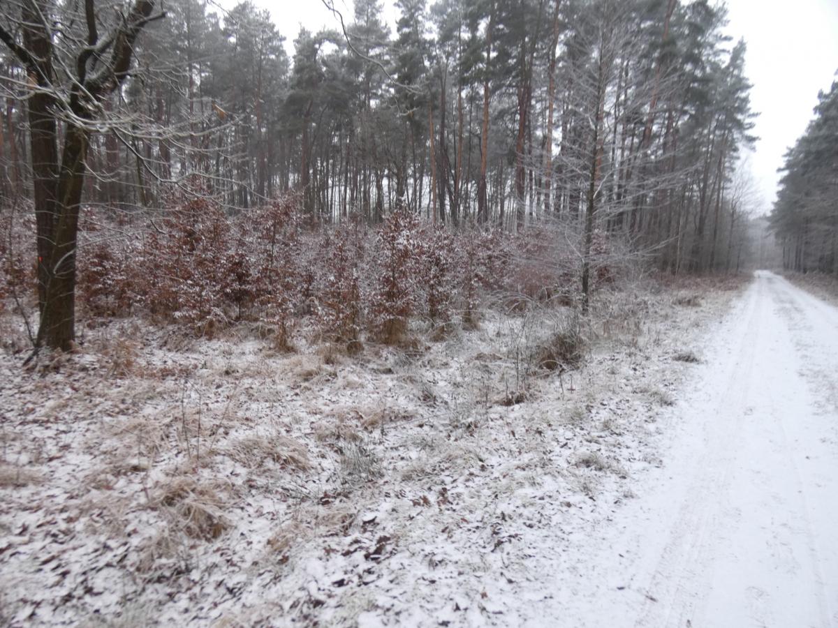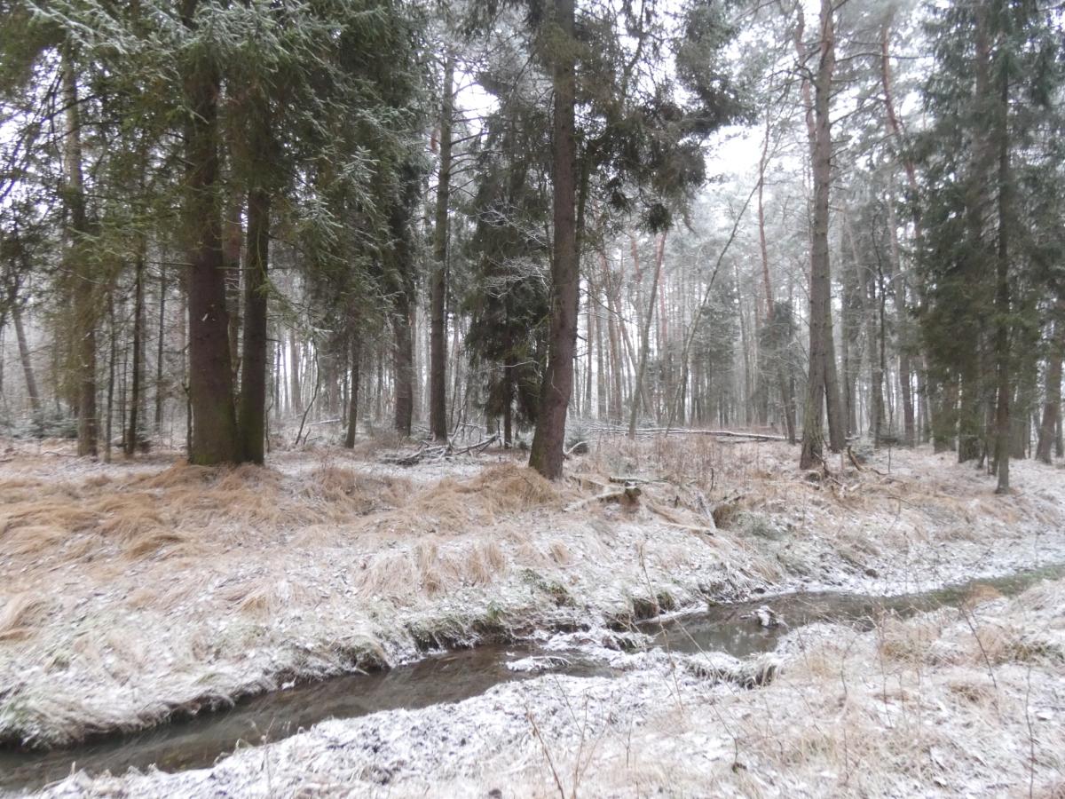 Jak przystało na drzewostany gospodarcze pozornie w okolicznych lasach czy to w Chrzanowe, czy to w Jaworznie pozornie botanicznie szału nie ma. Dominują kilkudziesięcioletnie sosny zwyczajne. Pomiędzy nimi trafiają się po większej części o połowę niższe świerki pospolite. Z drzew liściastych pojawiają się rodzime brzozy brodawkowate, topole osiki oraz dęby szypułkowe. Tak jak wszędzie i tutaj jest sporo dębu czerwonego oraz czeremchy amerykańskiej. Z tego powodu ten typ zbiorowiska określam mianem boru bardzo mieszanego. Tym razem całość pokrywał tytułowy puchowy śniegu tren, co powodowało całkiem przyjemne wrażenia dla naszych oczu. Kiedy jednak zagłębić się w szczegóły można zwrócić uwagę na wysoką wilgotność podłoża. Przekłada się to na obfitość takich traw jak trzcina pospolita oraz trzęślica modra. Do tego dochodzą sity rozpierzchłe. Gdybyśmy szli konsekwentnie na zachód, dotarlibyśmy do stawów Groble. My w połowie drogi do nich odbiliśmy w kierunku Kroczymiecha. Cały obszar leży w zlewni cieku noszącego obecnie nazwę Kanał Matylda. Pierwotnie przed wpuszczeniem go w Kanał była to Śmidra, Śmierdzonka, Śmierdząca Woda lub Kątecka Woda. Ślady jej dawnych koryt wciąż są czytelne w płatach lasu.