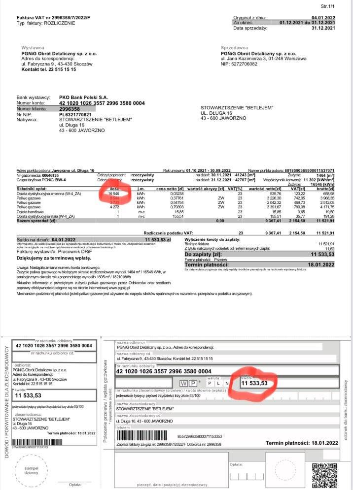 Grudniowy rachunek za gaz otrzymany przez stowarzyszenie przekroczył wszelkie wyobrażenia - kwota jest prawie 3 razy wyższa niż w 2020 roku.