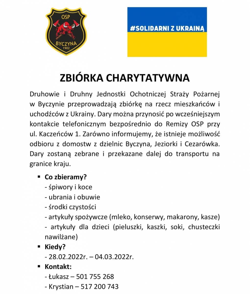 Pomoc, po wcześniejszym kontakcie telefonicznym,  można dostarczać do remizy OSP Byczyna przy ul. Kaczeńców 1. Istniej również możliwość odbioru artykułów z domów w Byczynie, Jeziorkach i Cezarówce.