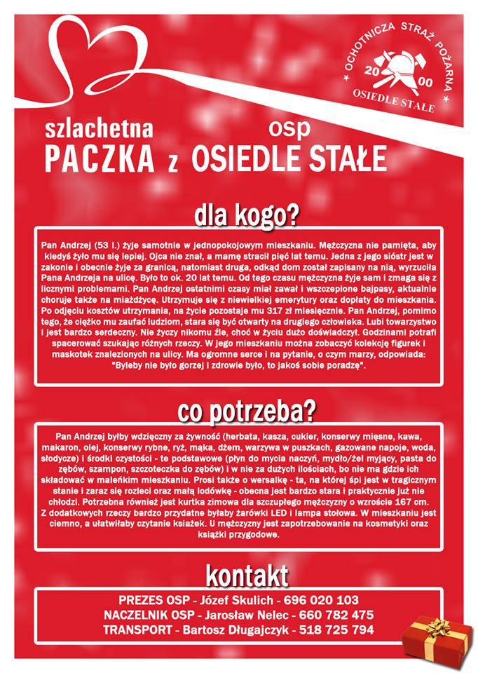Jeżeli chcieliby Państwo wspomóc Ochotniczą Straż Pożarną z Osiedla Stałego w zbiórce potrzebnych rzeczy dla pana Andrzeja, prosimy o kontakt z prezesem OSP - Józef Skulich- 696-020-103, naczelnikiem OSP - Jarosław Nelec - 660-782-475, transport - Bartosz Długajczyk - 518-725-794