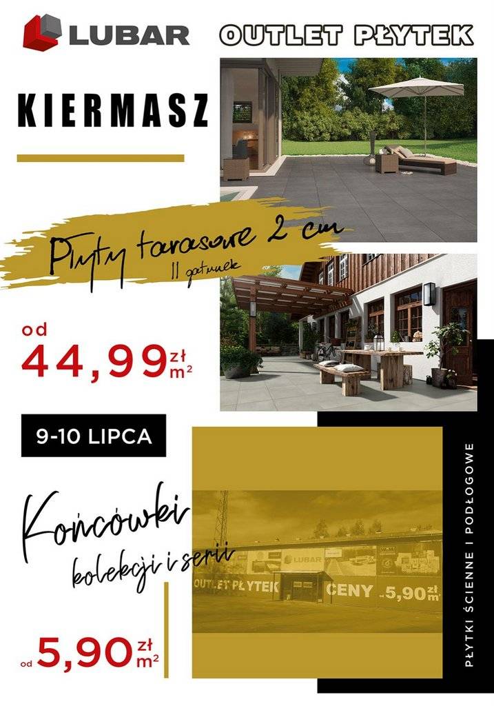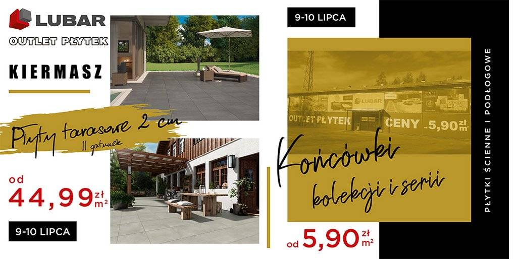Tegoroczny KIERMASZ outletu LUBAR będzie obejmował wybrane płytki tarasowe o grubości 2 cm drugiego gatunku oraz końcówki kolekcji płytek ściennych i podłogowych . Jeśli więc: