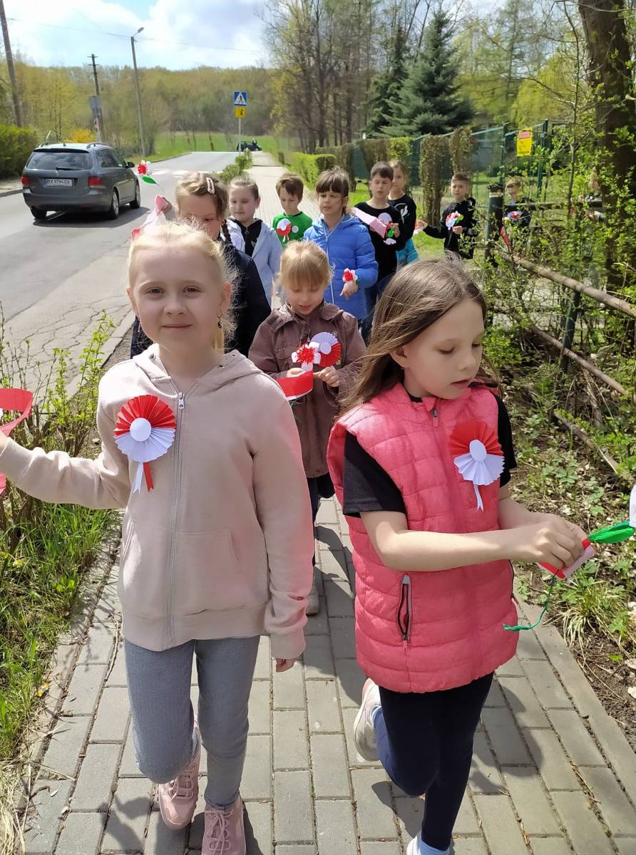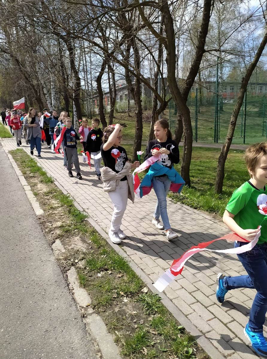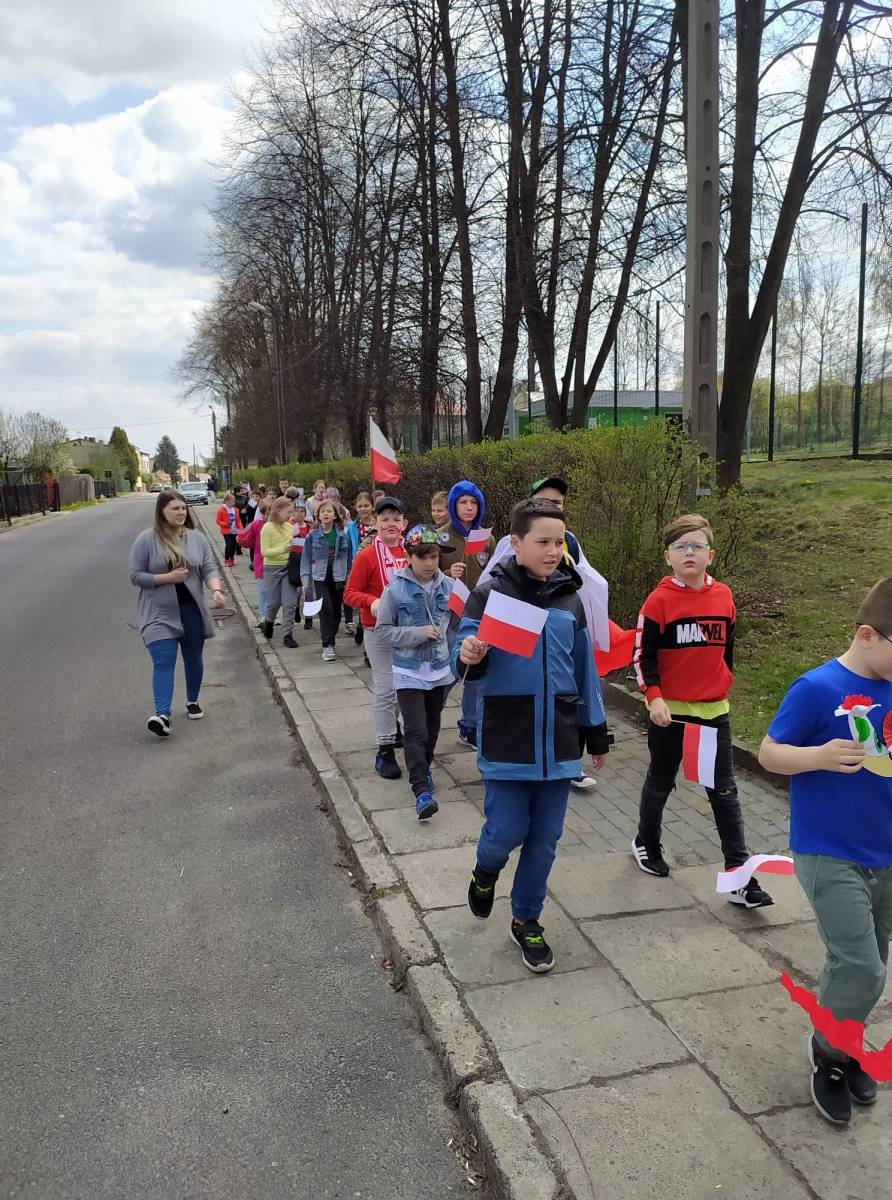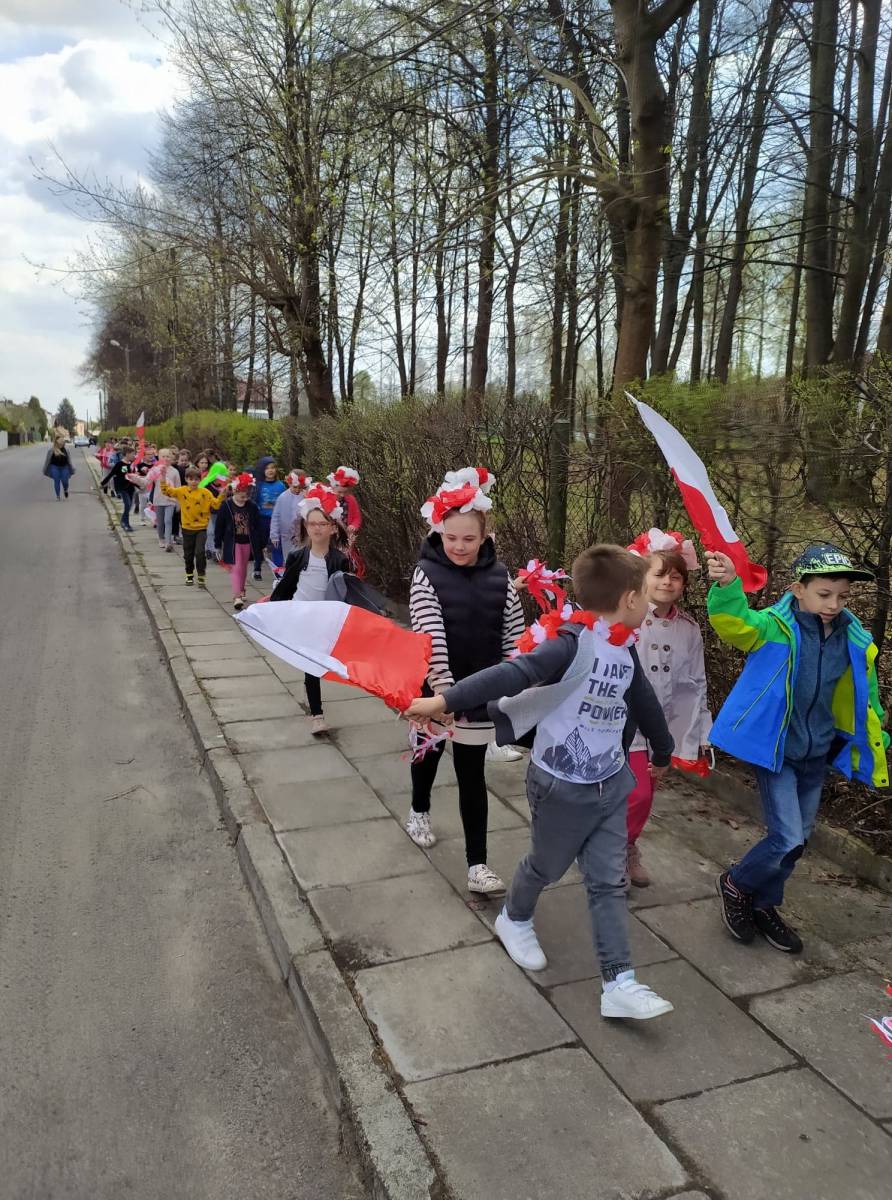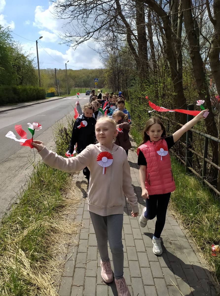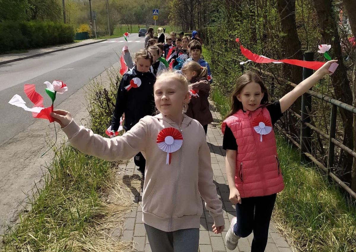 Uczniowie śpiewali pieśni patriotyczne m.in. "Witaj majowa jutrzenko", a napotkanym mieszkańcom dzielnicy rozdawali własnoręcznie wykonane biało - czerwone flagi.