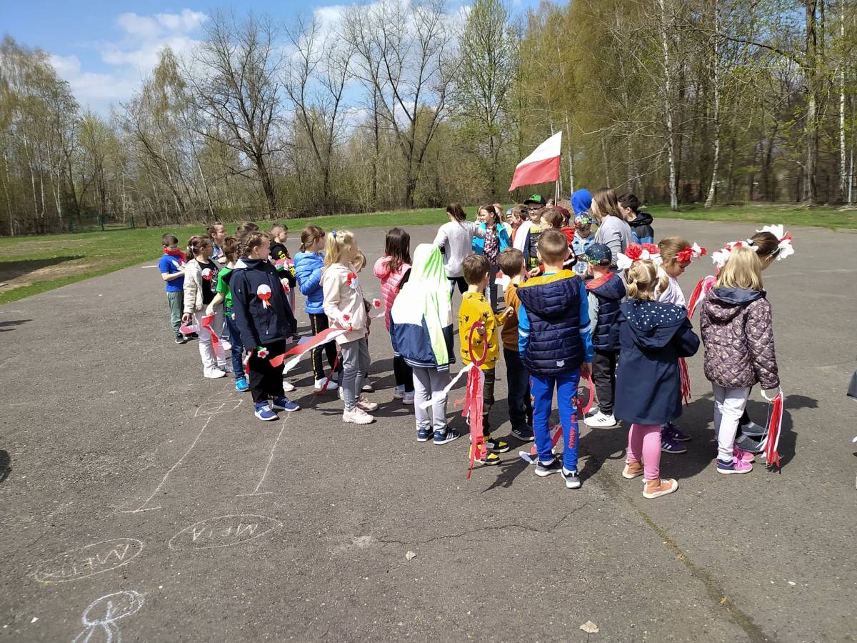 Podczas kolejnego patriotycznego happeningu uczniowie mieli atrybuty związane z Polską - Naszą Ojczyzną: biało-czerwone flagi, kotyliony, wstążki, a dziewczynki wianki we włosach.