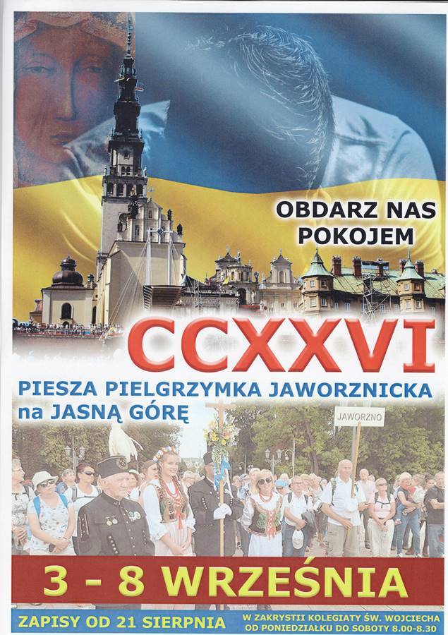 Poniżej przedstawiamy ogólny plan pielgrzymki oraz podstawowe informacje dotyczące pielgrzymki. Pielgrzymka jak co roku trwa od 3 września do 8 września. Rozpoczyna się Mszą św. w Kolegiacie św. Wojciecha w Jaworznie: