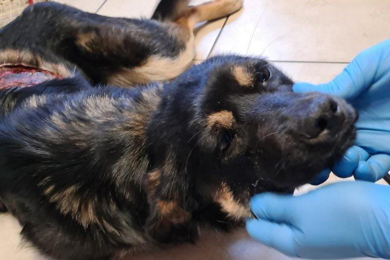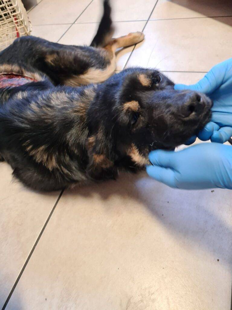 Psina nie ma skóry na grzbiecie. Rana gnijąca z ogniskami martwicy z dużym ubytkiem skóry...aktualnie przebywa w lecznicy i tam lekarze robią co mogą... - informuje Schronisko w Chełmku.