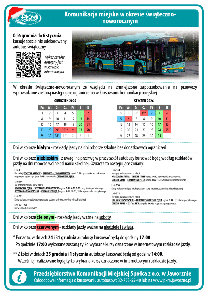 Przedsiębiorstwo Komunikacji Miejskiej w Jaworznie informuje o zmianie rozkładu jazdy autobusów przewoźnika w okresie świąt i Nowego Roku.