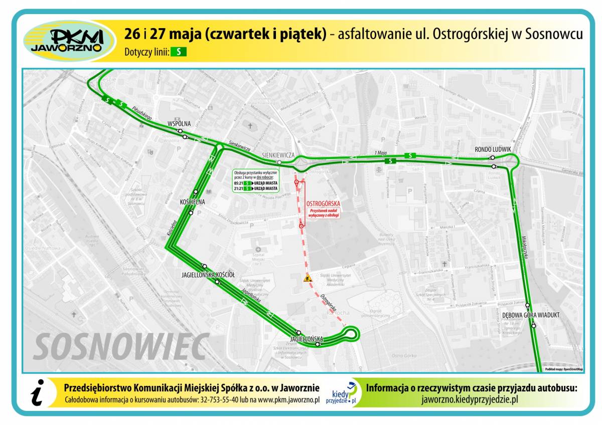 - Informujemy, że w dniach 26 i 27 maja (czwartek i piątek) w związku z asfaltowaniem ul. Ostrogórskiej w Sosnowcu wprowadzona zostanie trasa objazdowa dla linii S. Wszystkie przystanki na ul. Kościelnej i ul. Jagiellońskiej obsługiwane będą bez zmian. Autobusy będą zawracały z wykorzystaniem nowego ronda u zbiegu ul. Jagiellońskiej i Ostrogórskiej. Przystanek OSTROGÓRSKA pozostanie wyłączony z obsługi do czasu ukończenia przebudowy zatok - informuje przewoźnik.