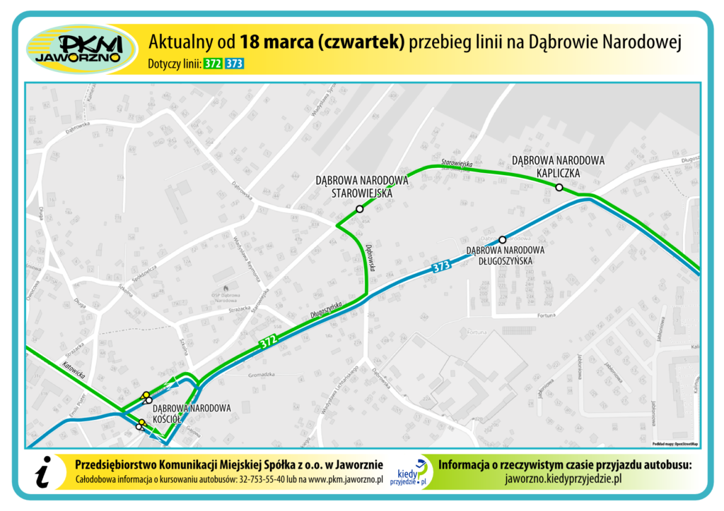 Zmiana dotyczy linii 372 i 373. Od 18 marca ponownie obsługiwany będzie w swojej stałej lokalizacji przystanek DĄBROWA NARODOWA KOŚCIÓŁ w kierunku przystanku końcowego SZPITAL PĘTLA.