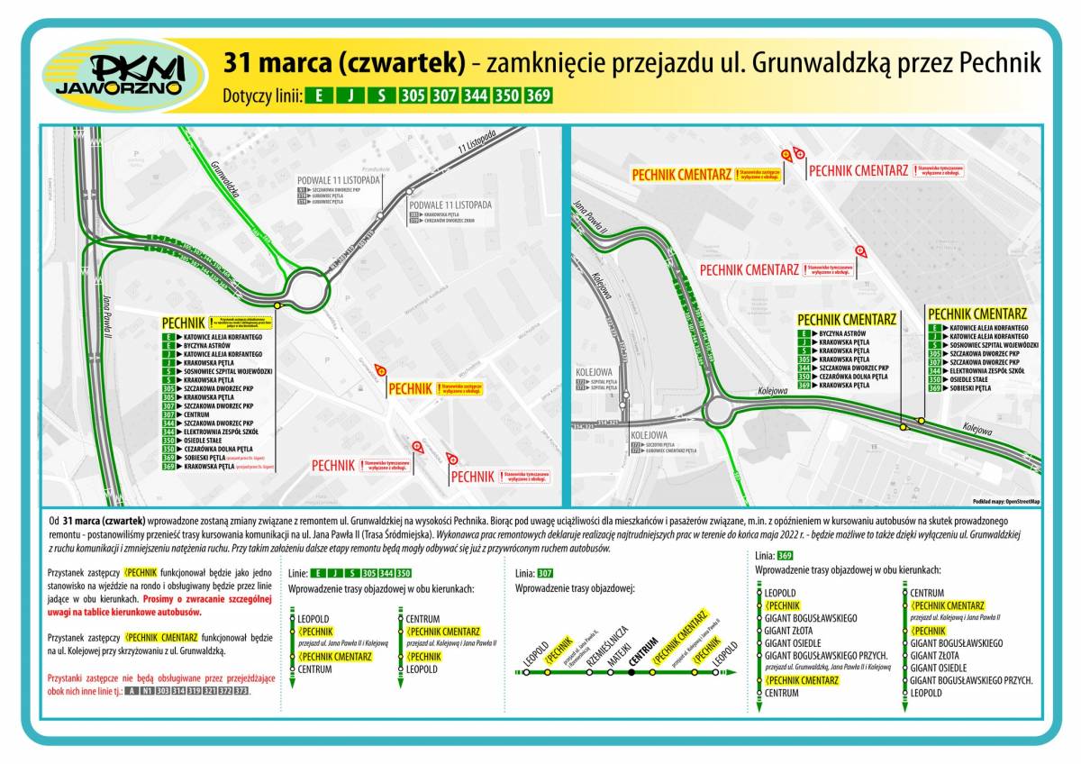Zmiana dotyczy linii E, J, S, 305, 307, 344, 350, 369 i związana jest z remontem ul. Grunwaldzkiej na wysokości Pechnika.
