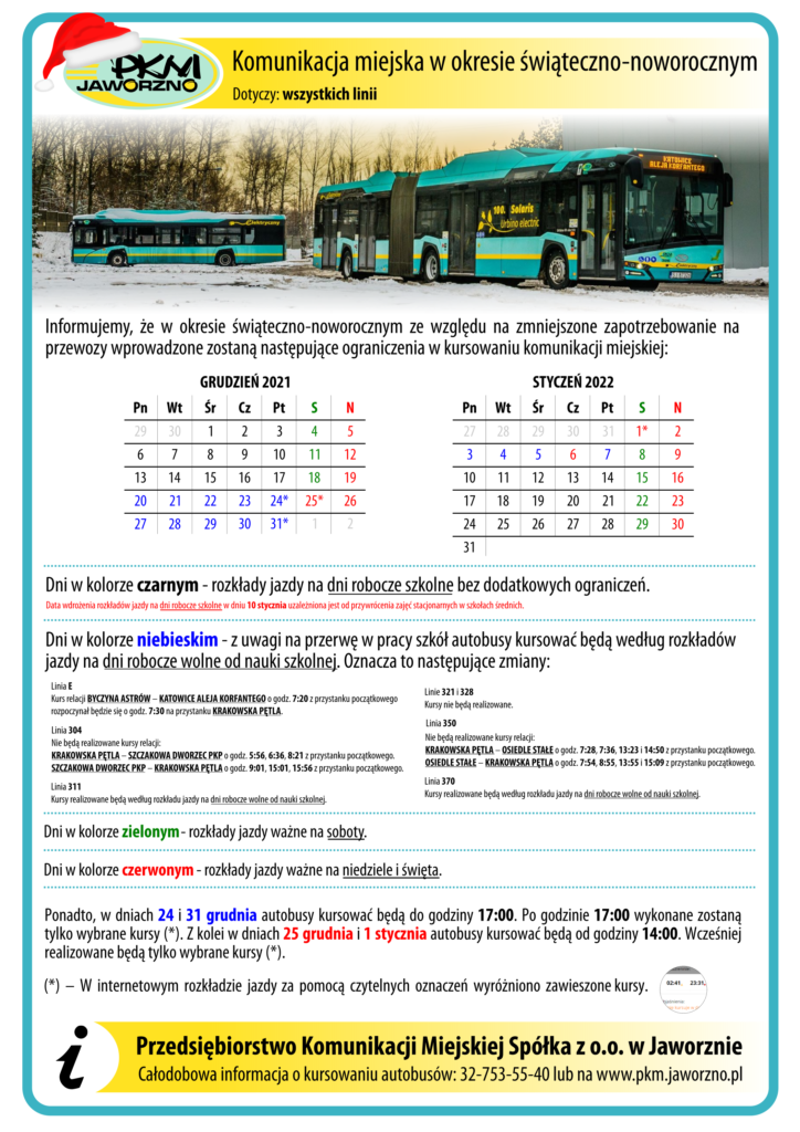 PKM Jaworzno - zmiana rozkładu jazdy w okresie świąteczno-noworocznym (od 20 grudnia)