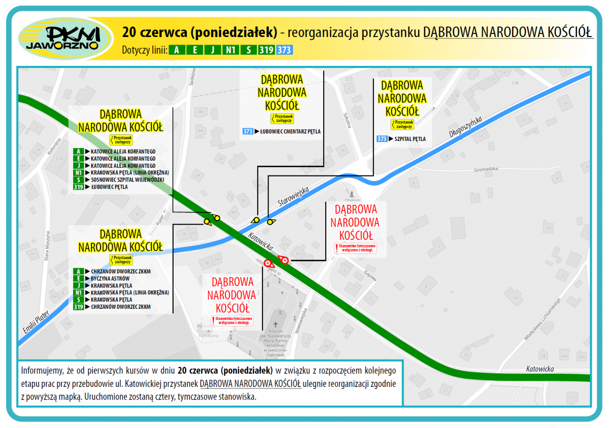 Zmiana dotyczy linii  A, E, J, N1, S, 319, 373. W związku z przebudową ul. Katowickiej, zostaną uruchomione 4 nowe przystanki, które zastąpią tymczasowo przystanek Dąbrowa Narodowa Kościół. Szczegóły na grafice poniżej.