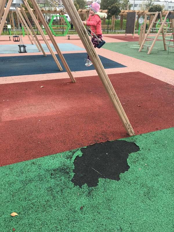 Nawierzchnia placu zabaw na plantach w Jaworznie nadaje się po sezonie do remontu.