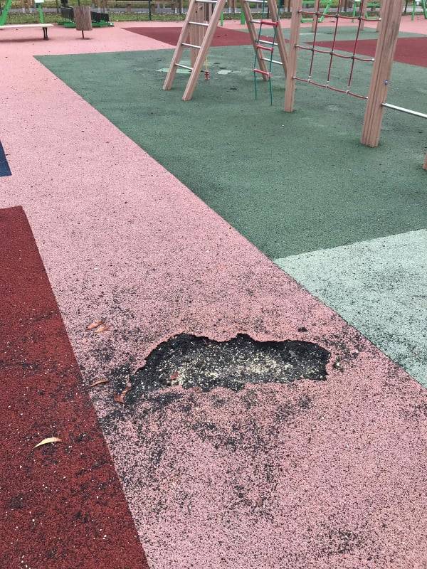 Obecny stan nawierzchni może stanowić zagrożenie dla bawiących się na placu zabaw dzieci. O potknięcie się na dziurze i wywrotkę nietrudno!