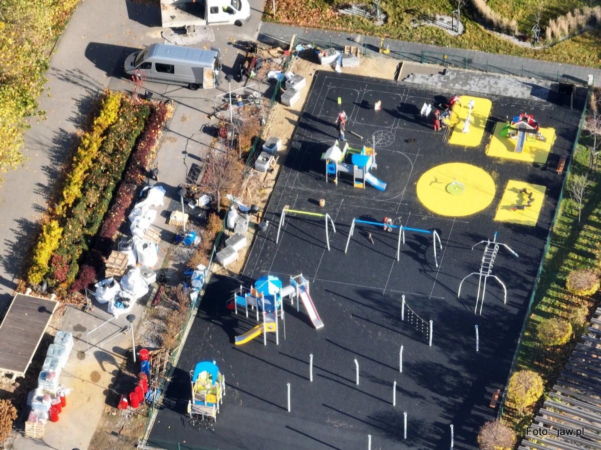 Część urządzeń została już postawiona. Pracownicy wyłożyli już nawierzchnię gumową i przechodzą do dalszych prac. Pierwsze efekty są już widoczne, a zaangażowanie każdego z robotników dodaje uroków tej inwestycji. Na miejscu stoją samochody ciężarowe z towarem, który jest niezbędny, by w określonym terminie plac mógł zostać oddany do użytku dla najmłodszych mieszkańców Jaworzna.