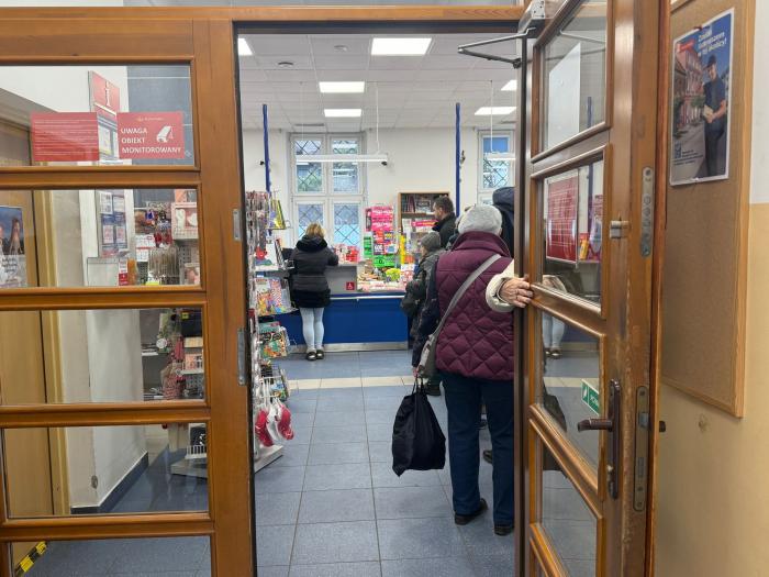 Cztery okienka są dostępne, ale otwarte są tylko dwa, przez co kolejka stale rośnie. Ponad godzina czekania to już przesada. Ludzie stoją na zewnątrz, starsze osoby czekają w kolejce ponad pół godziny.