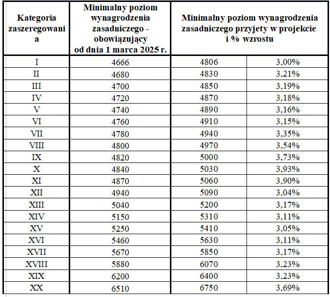 Propozycja ministerstwa zakłada, że w przypadku pracowników I kategorii zatrudnionych na umowie o pracę minimalne wynagrodzenie zasadnicze wyniosłoby 4 806 zł, a w przypadku pracowników XX kategorii – 6 750 zł.