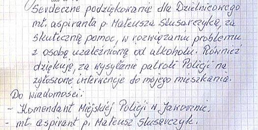 List otrzymał komendant jaworznickiej policji inspektor mgr Krzysztof Gałuszka. Mieszkaniec ulicy Piłsudskiego (Podłęże) dziękuje w nim dzielnicowemu, młodszemu aspirantowi Mariuszowi Ślusarczykowi, za pomoc w rozwiązaniu problemu z osobą uzależnioną od alkoholu dzielnicowemu. Jaworznianin podziękował też patrolom policji podejmującym interwencje w jego sprawie.