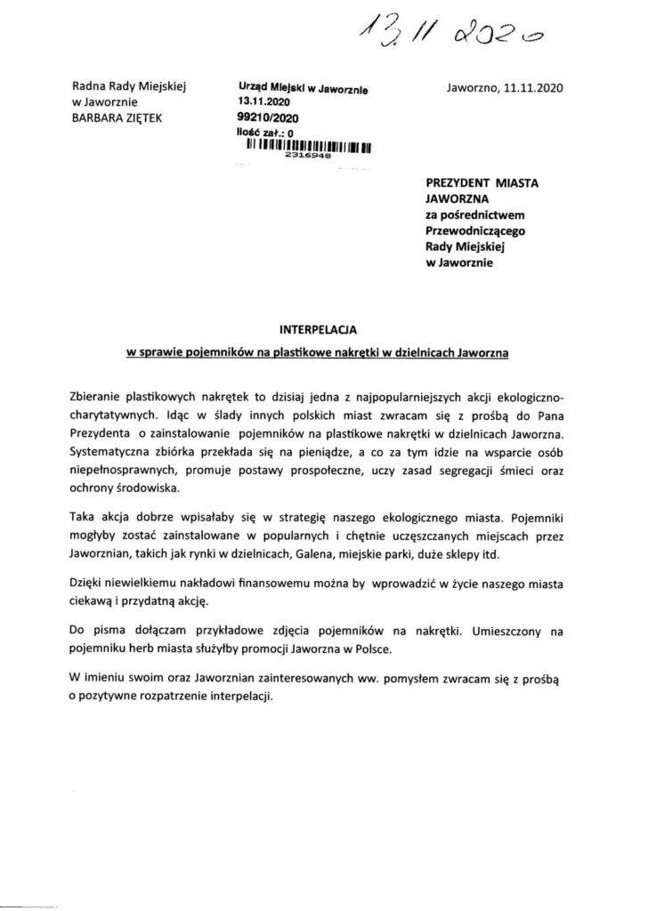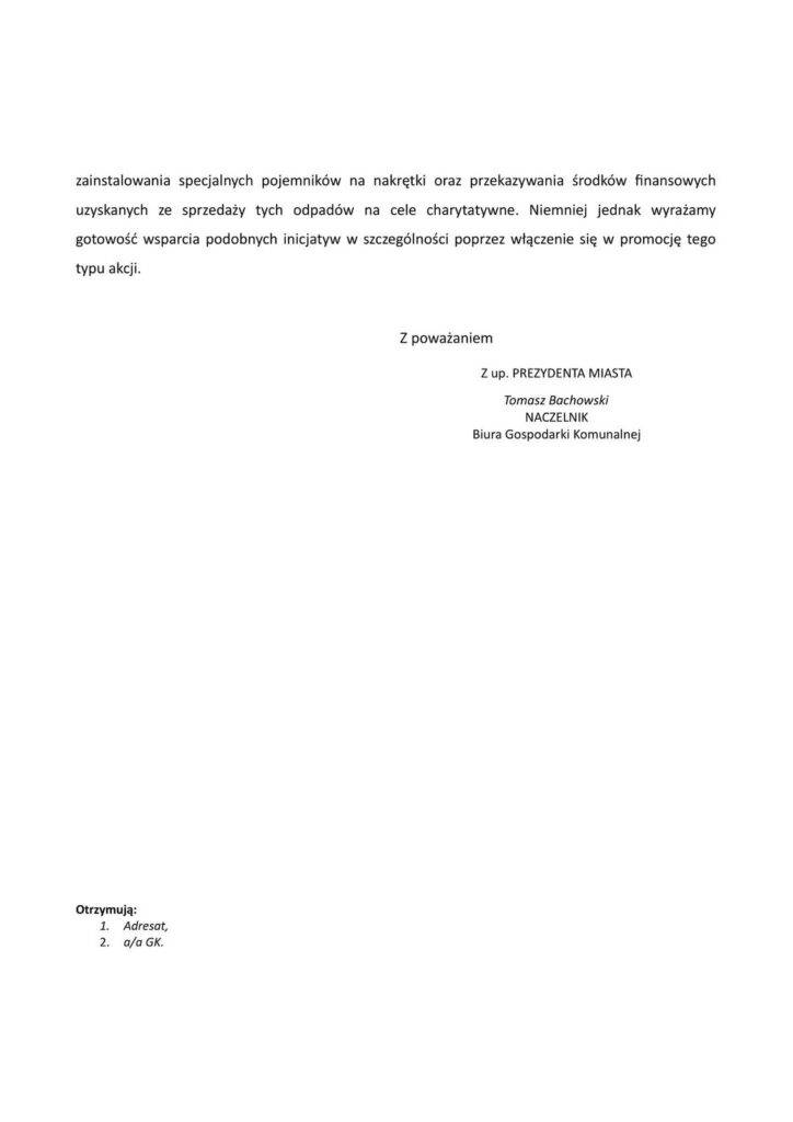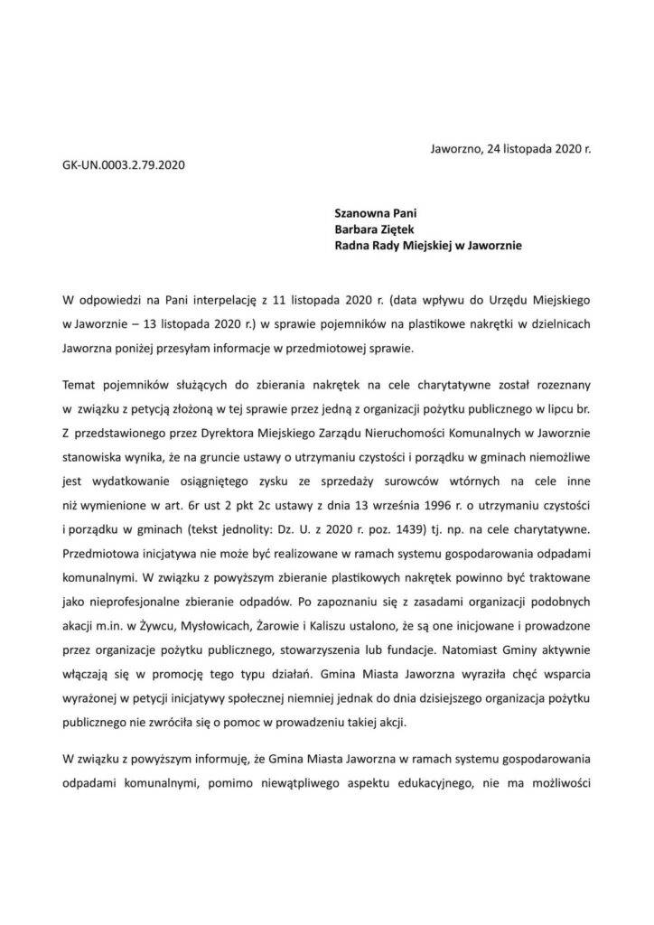 Z odpowiedzi którą dostała wynika, że gmina Miasta Jaworzna w ramach systemu gospodarowania odpadami komunalnymi nie ma możliwości zainstalowania specjalnych pojemników na nakrętki oraz przekazywania środków finansowych uzyskanych ze sprzedaży tych odpadów na cele charytatywne. Niemniej jednak gmina wyraża gotowość wsparcia podobnych inicjatyw w szczególności poprzez włączenie się w promocję tego typu akcji.