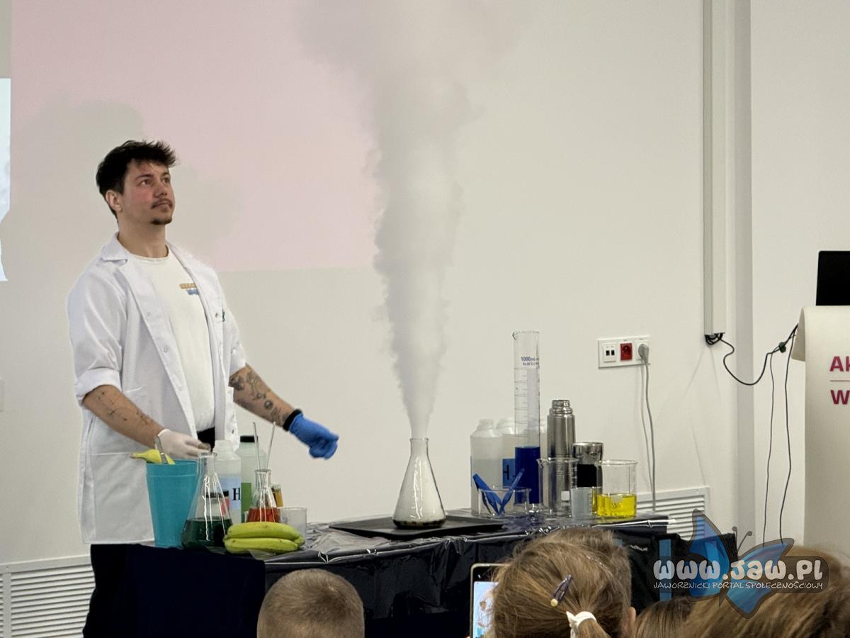 Dzień pokazowy w Jaworznickim Uniwersytecie Dziecięcym działającym przy Akademii WSB w Jaworznie. Uczniowie szkół podstawowych wzięli udział w pokazowych warsztatach z chemii, gdzie poprzez zabawę poznawali ciekawostki oraz mogli zobaczyć chemiczne eksperymenty.