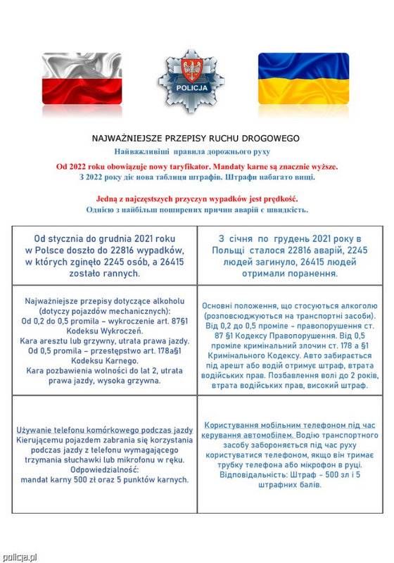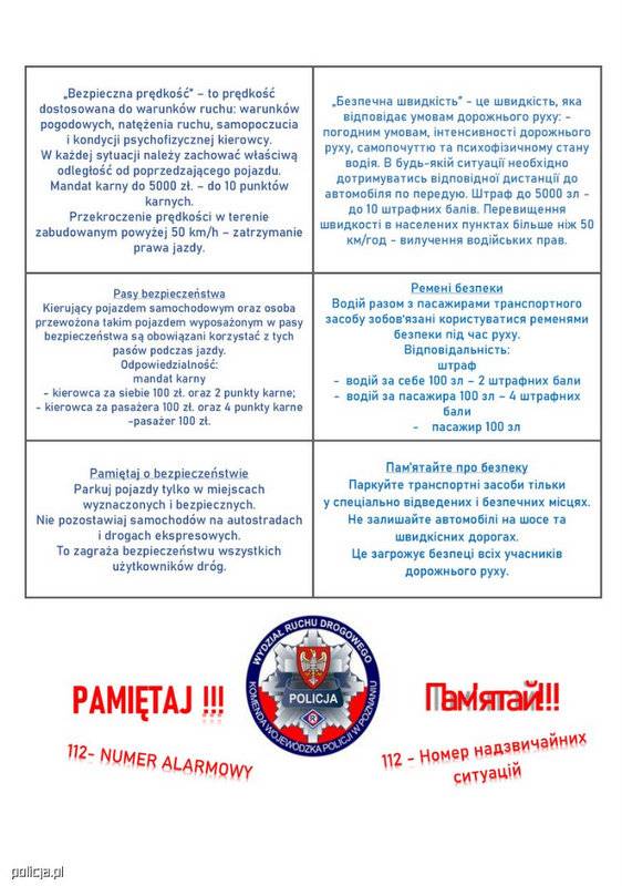Następnie tabela informuje o zakazie używania telefonu komórkowego w czasie jazdy, za co grozi mandat karny w wysokości 500 złotych oraz 5 punktów karnych. Dalej wspomina się o tzw. Bezpiecznej prędkości, czyli prędkości, z jaką powinniśmy się poruszać naszym pojazdem, a na którą wpływ mają panujące warunki atmosferyczne na drodze, także natężenie ruchu czy własne samopoczucie. Do tego przypomina się o zachowaniu odpowiedniej odległości od poprzedzającego nas pojazdu. Tutaj również nadmienia się karę, jaka grozi kierowcy, gdy tej prędkości lub odległości nie zachowa. Mandat karny do 5 tys. złotych i możliwość zdobyć do 10 punktów karnych no, chyba że przekroczymy prędkość powyżej 50 km/h w terenie zabudowanym to wówczas kierowca z Ukrainy, który tego dokona straci prawo jazdy. Ostatnimi dwoma elementami, o których przypominają funkcjonariusze są pasy bezpieczeństwa oraz parkowanie w wyznaczonych do tego miejscach. W przypadku niezapięcia pasów kierowcy grozi mandat karny w wysokości 100 złotych oraz 2 punktów karnych, a w przypadku, gdy to pasażer nie zapnie to dodatkowo kierowcy grozi mandat karny w wysokości 100 złotych oraz 4 punkty karne, pasażer natomiast otrzymuje jedynie mandat karny w wysokości 100 złotych.