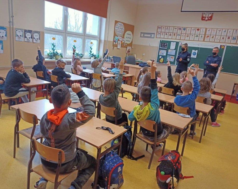 Podczas spotkania z uczniami klasy 1 profilaktyk razem z dzielnicowym rozmawiali z dziećmi o szeroko rozumianym bezpieczeństwie oraz niebezpieczeństwach, jakie mogą czekań na dzieci. Poza omówieniem najważniejszych przepisów policjanci udzielili uczniom porad praktycznych, każdorazowo przypominają numery alarmowe i sposoby prawidłowego wzywania pomocy. Przybliżyli również, jak wygląda na co dzień praca policjanta. Uczniowie mieli możliwość obejrzenia radiowozu oraz otrzymali na pamiątkę odblaski.