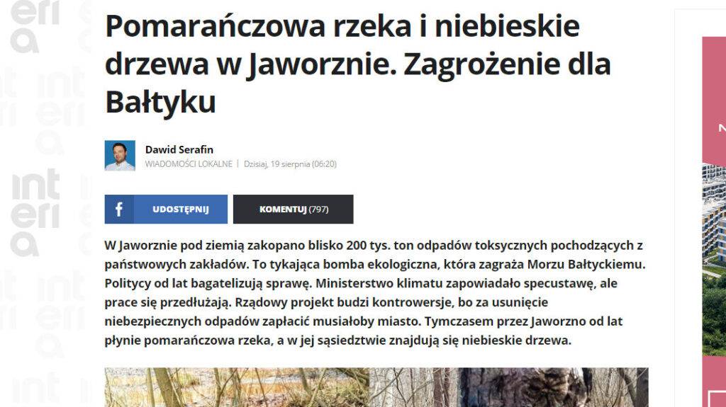 W Jaworznie zakopanych jest prawie 200 tys. ton toksycznych odpadów pochodzących z niedziałających już Zakładów Chemicznych "Organika Azot". Stanowią one zagrożenie dla ekosystemu, mogą oddziaływać nawet na Morze Bałtyckie. Ministerstwo Klimatu obiecuje specustawę, która miałaby wymuszać usunięcie odpadów. - informuje dziś na stronie głównej interia.pl Dawid Serafin.