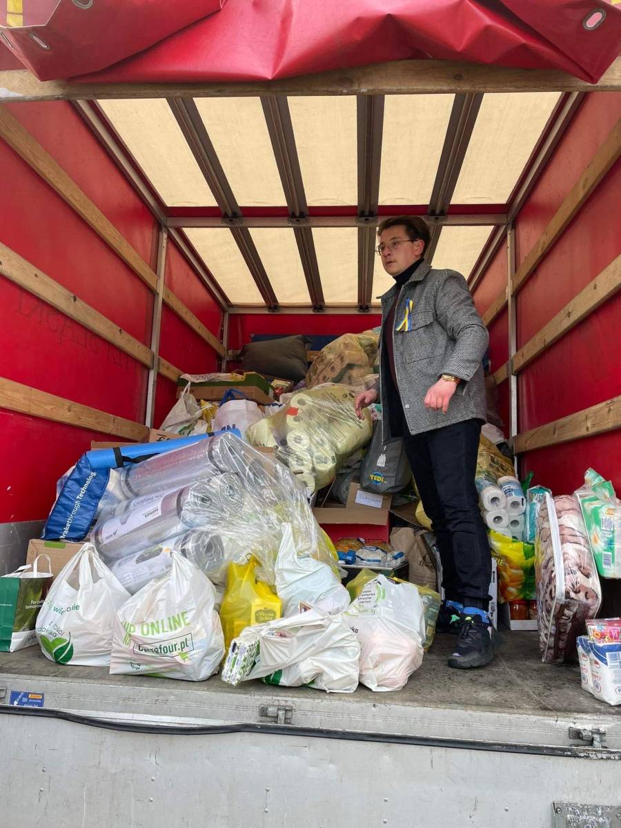 Organizator zbiórki, Marcin Zapart, informuje o kilku tonach produktów przekazanych przez jaworznian na pomoc Ukrainie.