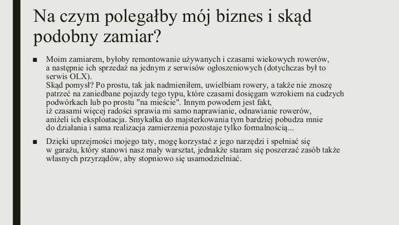 Szymon Cichoń: Moim pomysłem na biznes jest kupno starych, zepsutych, używanych rowerów na portalach ogłoszeniowych, a następnie ich naprawa, regulacja i wymiana potrzebnych części oraz sprzedaż. W przyszłości chciałbym otworzyć własny serwis rowerowy.