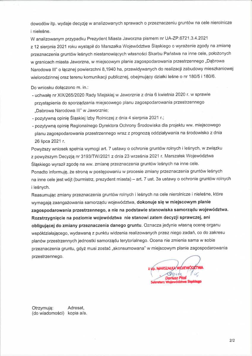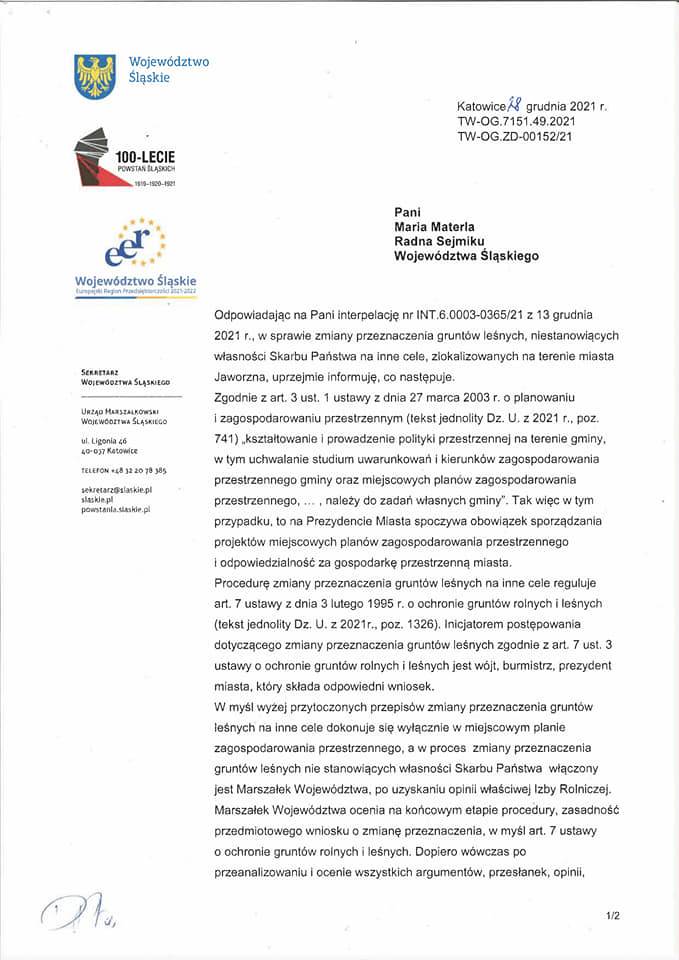 Maria Materla zwróciła się do marszałka województwa śląskiego z pytaniem o zmianę gruntów leśnych lezących na terenie Jaworzna, które nie są własnością Skarbu Państwa, na inne cele. W odpowiedzi czytamy, że taka zamiana dokonuje się w miejscowym planie zagospodarowania przestrzennego, bez udziału samorządu województwa. Rozstrzygnięcie na poziomie województwa nie jest w tym przypadku wiążące.