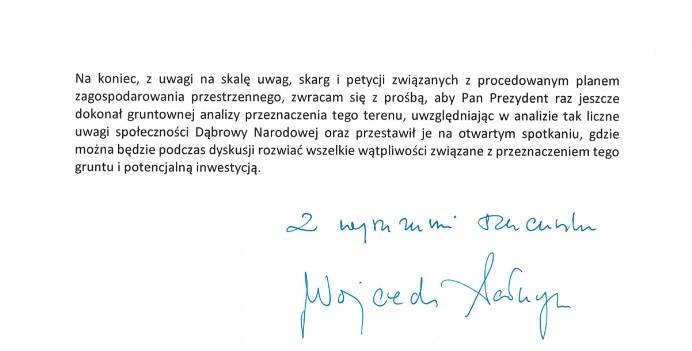 Na koniec Saługa proponuje ponowną analizę przeznaczenia terenu - tym razem z wzięciem pod uwagę uwag mieszkańców okolicy, oraz organizację otwartego spotkania z mieszkańcami, gdzie można byłoby wyjaśnić wszystkie wątpliwości.