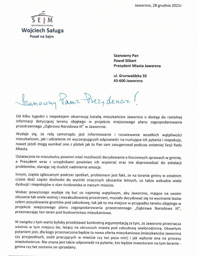 Poseł zwraca się z prośbą o przestawienie argumentacji, z jakiego powodu las leżący na obrzeżach miasta został wytypowany jako nowe miejsce pod zabudowę wielorodzinną. Saługa chciałby również wiedzieć, kto ma być odbiorcą mieszkań powstałych na pozyskanych w wyniku terenach - miejscowi czy przyjezdni mieszkańcy. Poseł pyta również, kto będzie odpowiadał za budowę bloków - miasto czy zewnetrzny inwestor.