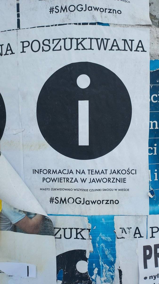 Na terenie Jaworzna na słupach ogłoszeniowych można znaleźć plakaty, na których ktoś poszukuje informacji na temat jakości powietrza w naszym mieście. Ponadto informują one o tym, że w Jaworznie zlikwidowano czujniki smogu, więc nie wiadomo czy dobre, czy złe jest powietrze, którym oddychamy.