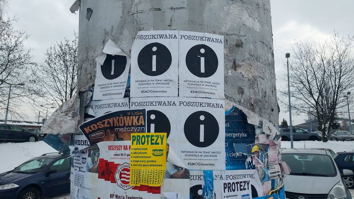 Poszukiwana informacja na temat jakości powietrza w Jaworznie — takie oto plakaty można znaleźć na terenie słupów ogłoszeniowych w naszym mieście.