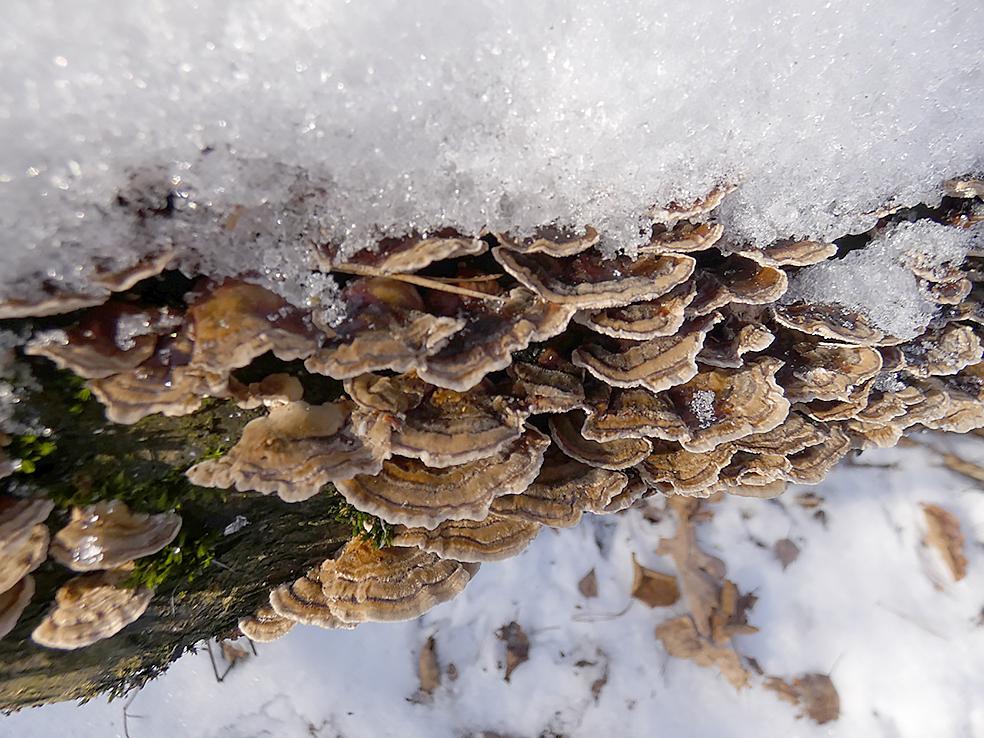 Przy północno-zachodnim skraju wzniesienia natrafiłem na grupę dzikiego bzu czarnego. To bardzo stare krzewy. Na ich pniach oraz gałązkach w roli epifitów spełniają się mchy z rodzaju szurpek. Pozbawione kory drewno pokrywa biały nalot strzępnika bzowego. Na gałązkach są jeszcze żółte skupiska złotorostu ściennego.